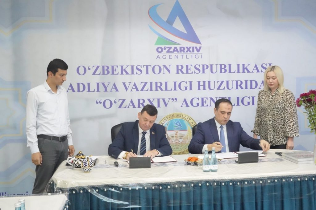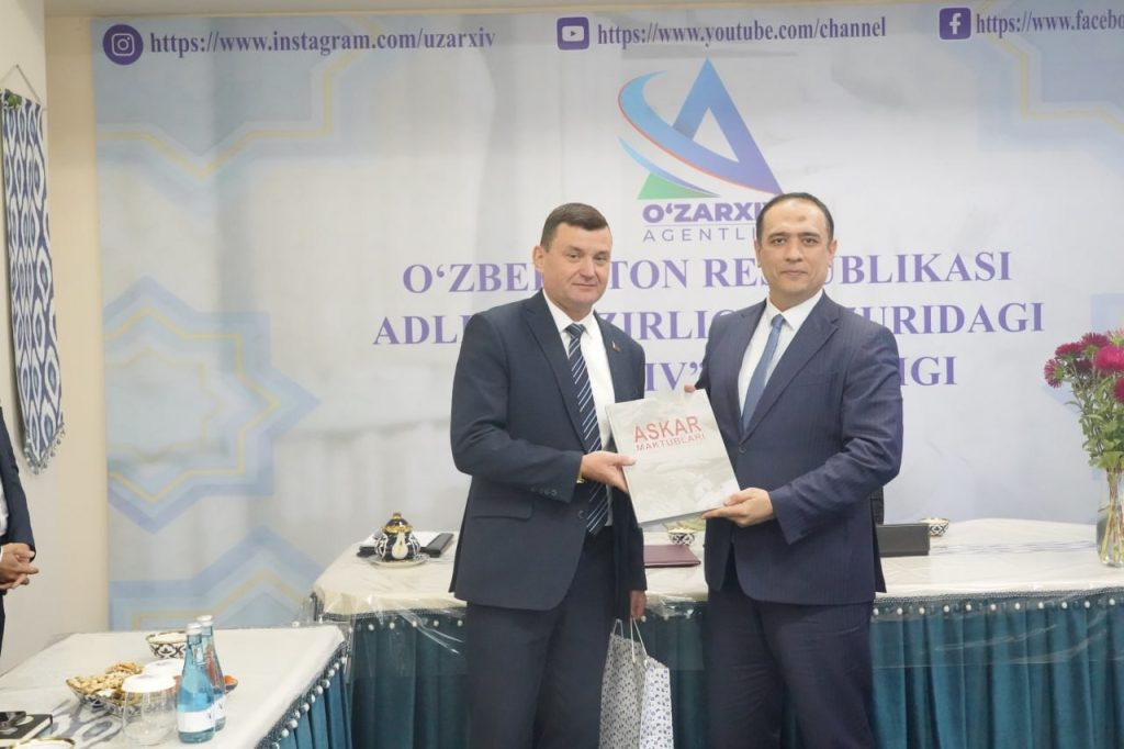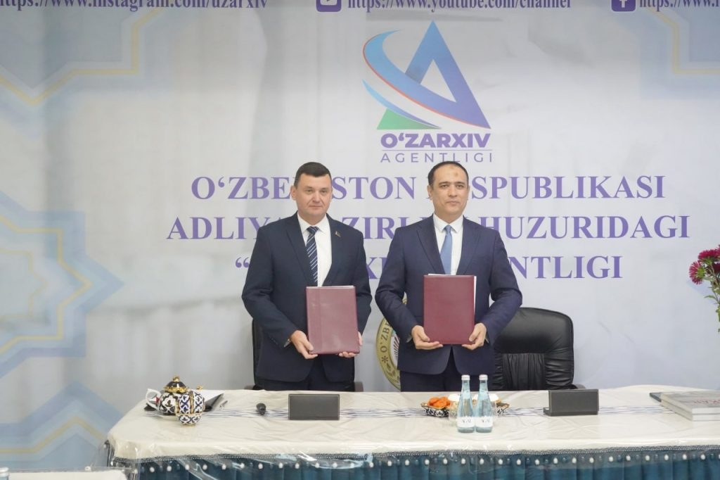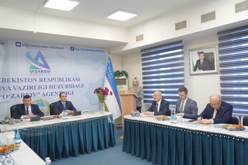 В Агентстве «Узархив» при Министерстве юстиции Республики Узбекистан (г. Ташкент) состоялась торжественная церемония подписания Плана совместных действий по развитию сотрудничества между архивными учреждениями Республики Беларусь и Республики Узбекистан на 2025–2027 годы. Под документом свои подписи поставили директор Агентства «Узархив» при Министерстве юстиции Республики Узбекистан У.М.Юсупов и директор Департамента по архивам и делопроизводству Министерства юстиции Республики Беларусь О. Л. Воинов.