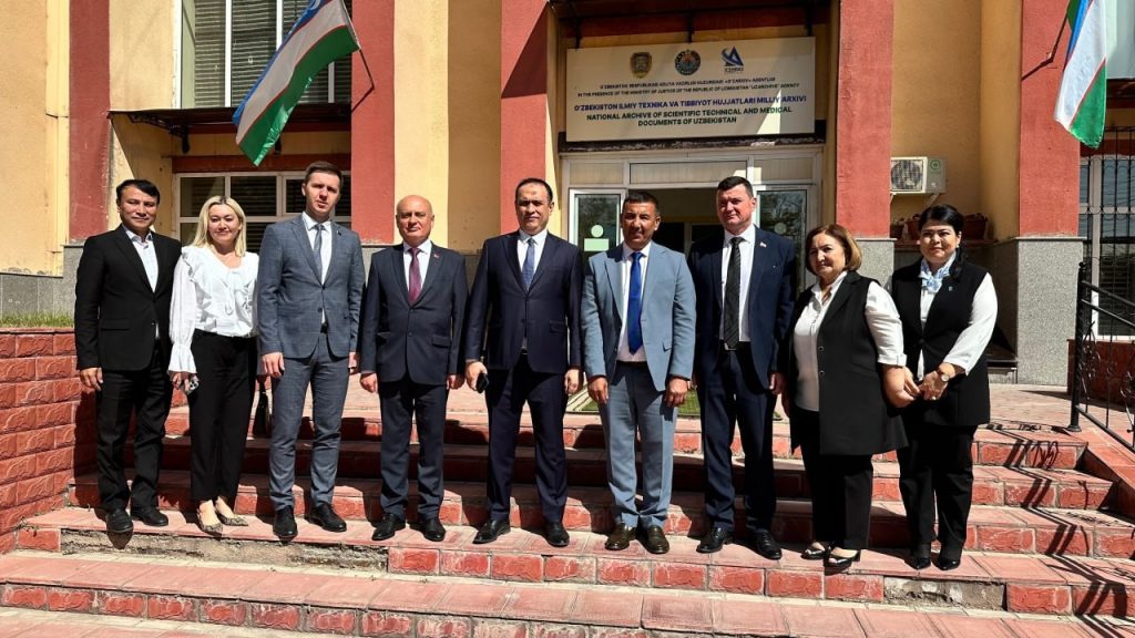Совместная фотография белорусской и узбекской делегаций у входа в Национальный архив научно‑технической и медицинской документации Республики Узбекистан