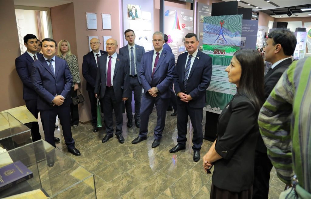 Делегация Республики Беларусь в ходе ознакомления с выставочной экспозицией, подготовленной специалистами Национального архива научно‑технической и медицинской документации Республики Узбекистан